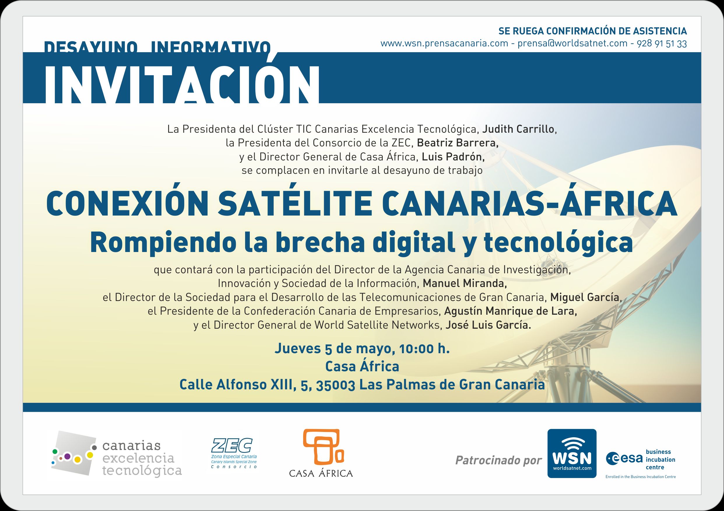 Por todo esto, el Clúster TIC Canarias Excelencia Tecnológica, la Zona Especial Canaria (ZEC, dependiente del Ministerio de Hacienda y Administraciones Públicas) y Casa África quieren presentar en esta jornada casos de éxito y abordar en este encuentro modos de reducir la brecha digital, extender la comunicación satélite, la banda ancha y, así, la total cobertura de internet en África desde Canarias.