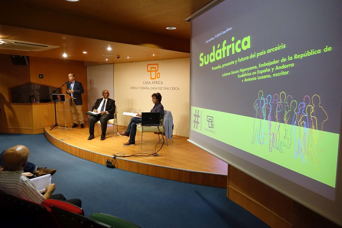 El embajador de Sudáfrica en España, Lulama Smuts Ngonyama, mantuvo ayer una conversación con el escritor Antonio Lozano sobre su país en el auditorio Nelson Mandela de Casa África. La charla del diplomático sudafricano, que se enmarcaba en el programa #ÁfricaEsNoticia, se denominó Sudáfrica: pasado, presente y futuro del país arco iris y formó parte de las acciones que Ngonyama lleva a cabo para despedirse de nuestro país, donde está destinado desde diciembre de 2014 y preside, de manera honorífica, la recientemente creada Cámara de Comercio de Sudáfrica en España.