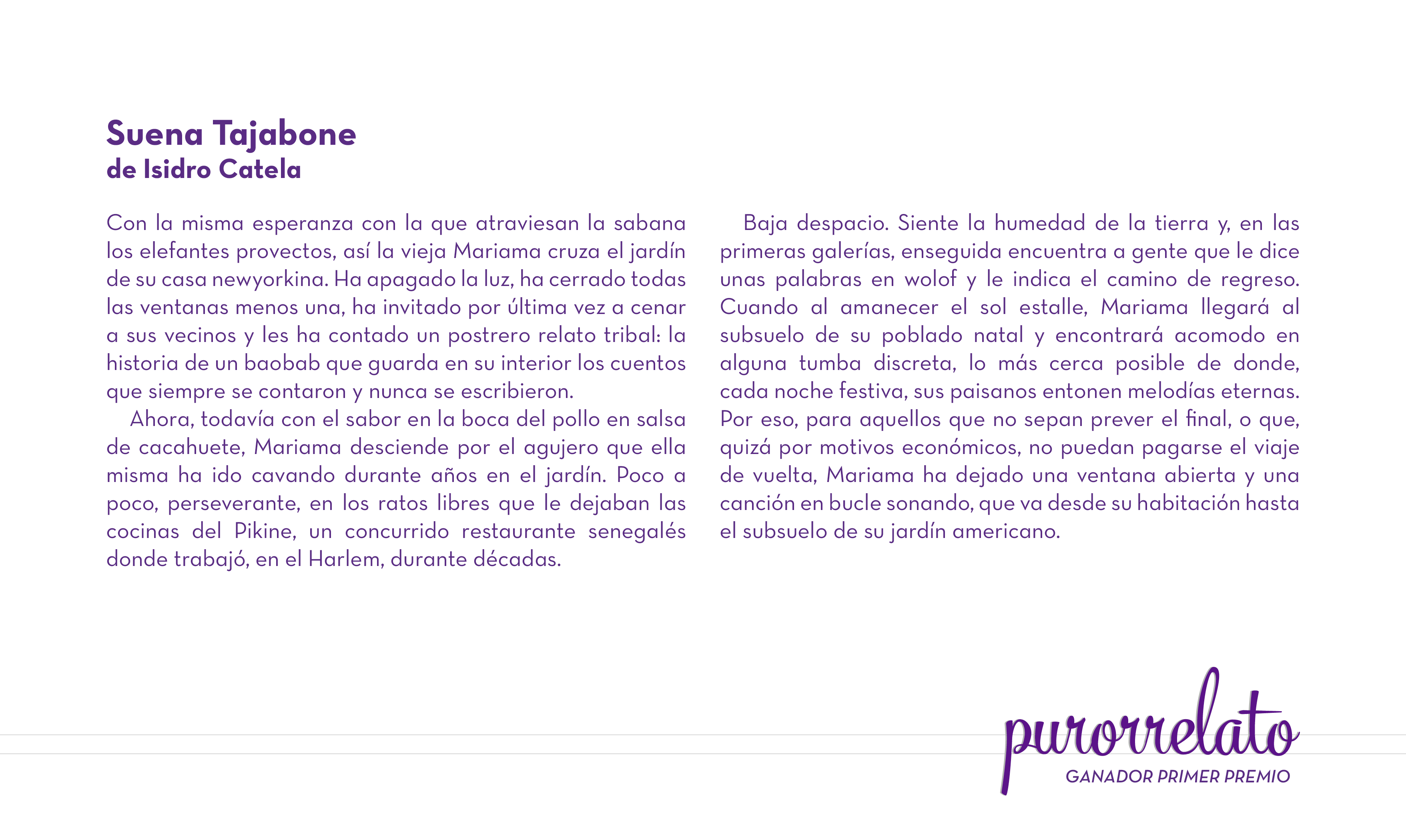 «Este año las historias ganadoras hablan de puentes, de conexión entre culturas, universos, tiempos, vidas y sueños. Se diría que este nexo común es una invitación a reflexionar y a poner el énfasis en lo que nos une y no en lo que nos separa y a apostar por una diversidad integradora». Así concluye el acta del fallo del jurado de la quinta edición del concurso de microrrelatos Purorrelato, organizado por Casa África, y que en esta ocasión ha ganado el salmantino residente en Madrid Isidro Catela Marcos, que firma el texto denominado Suena Tajabone.