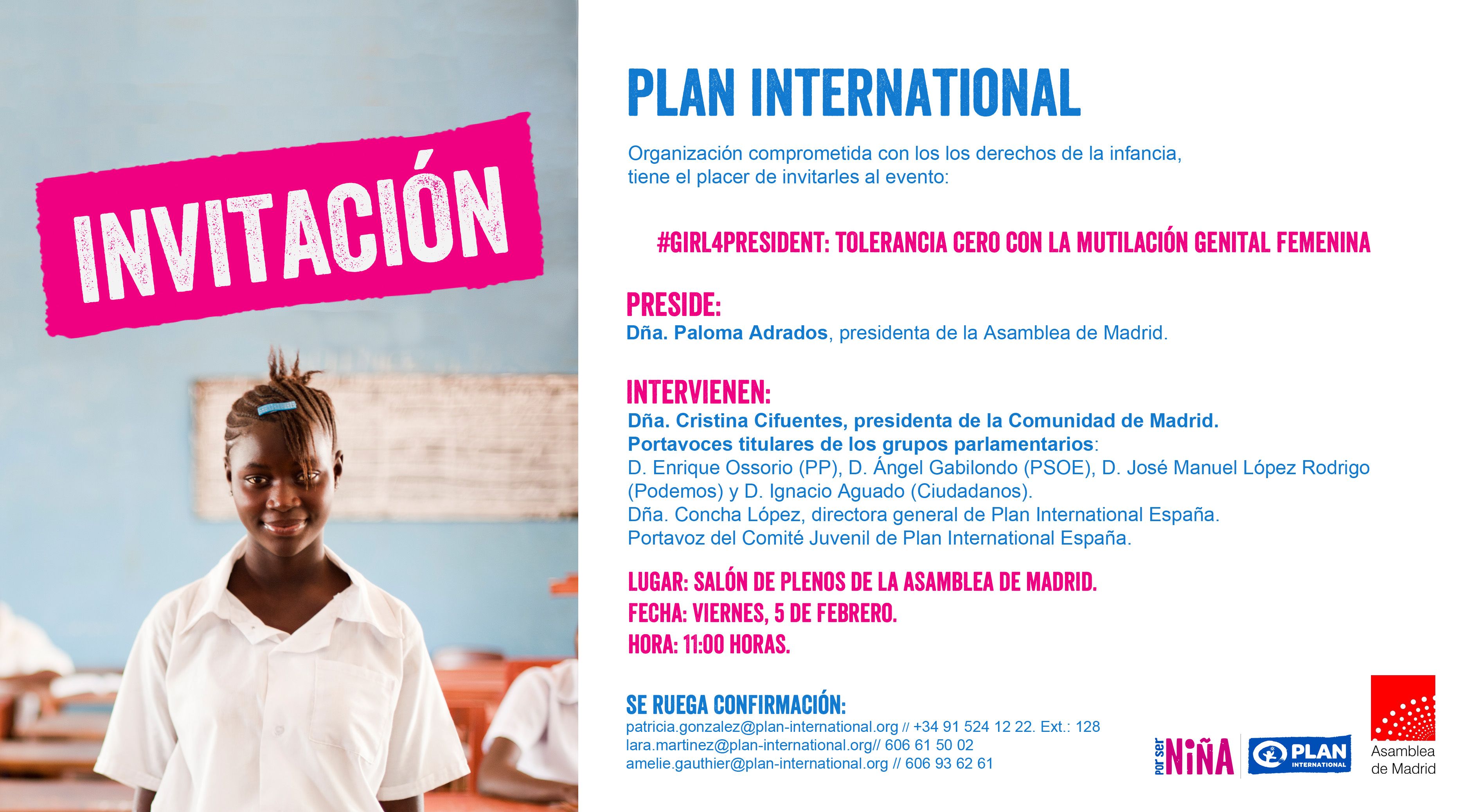 El acto, que tendrá lugar en el Salón de Plenos de la Asamblea de Madrid el 5 de febrero de 2016 a las 11h, estará presidido por Dña. Paloma Adrados, Presidenta de la Asamblea de Madrid. Asistirá también la presidenta de la Comunidad de Madrid, Dña. Cristina Cifuentes; los Portavoces de todos los Grupos Parlamentarios; Dña. Concha López, directora general de Plan International; y una niña del Comité Asesor Juvenil de Plan International España.