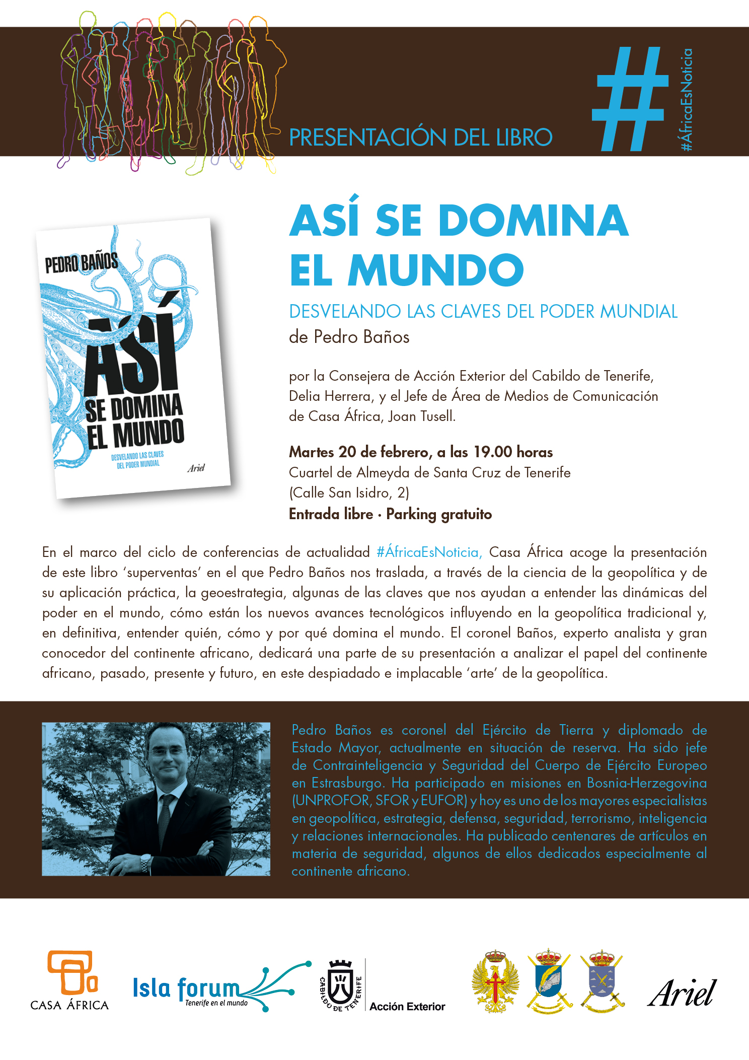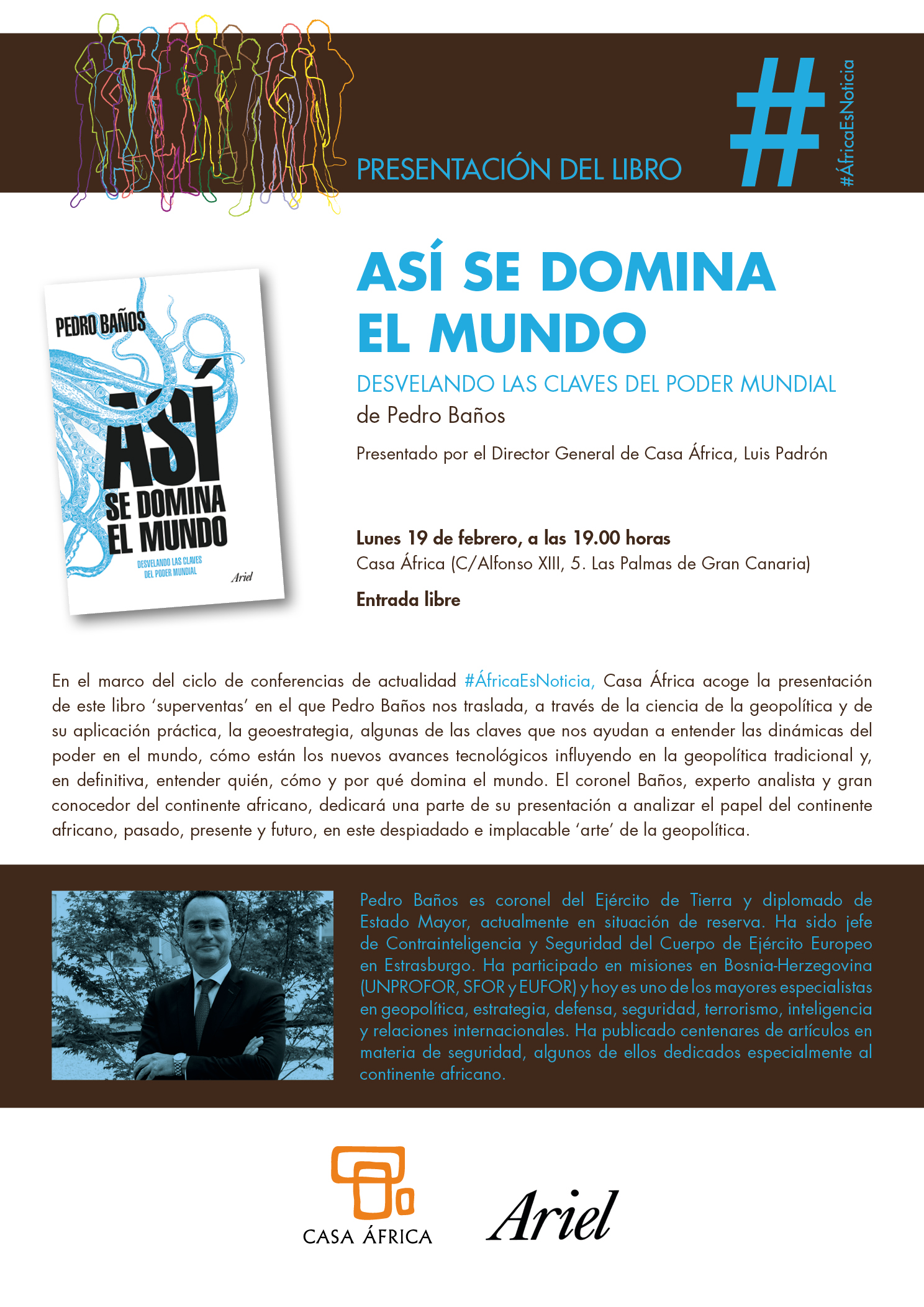 Para hablar de todo ello, en el marco del ciclo de conferencias de actualidad #ÁfricaEsNoticia, Casa África acoge la presentación de este libro en el que Pedro Baños nos traslada, a través de la ciencia de la geopolítica y de su aplicación práctica, la geoestrategia, algunas de las claves que nos ayudan a entender las dinámicas del poder en el mundo, cómo están los nuevos avances tecnológicos influyendo en la geopolítica tradicional y, en definitiva, entender quién, cómo y por qué domina el mundo. El coronel Baños, experto analista y gran conocedor del continente africano, dedicará una parte de su presentación a analizar el papel del continente africano, pasado, presente y futuro, en este despiadado e implacable "arte" de la geopolítica.