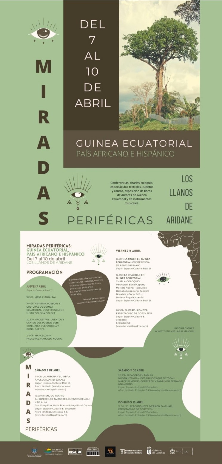 A las 17:45 h. charla coloquio: “La oralidad en Guinea Ecuatorial” con la participación de Bönaí Capote, Marcelo Ndong, Raimundo Bernabé Nnandong y Gorsy Edú. Modera: Ángela Nzambi.