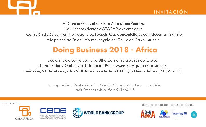 Usted está aquíCasa África › Imágenes 21/02/2018Madrid Colección relacionada Presentación del informe Doing Business 2018 - África Contenido relacionado Valencia