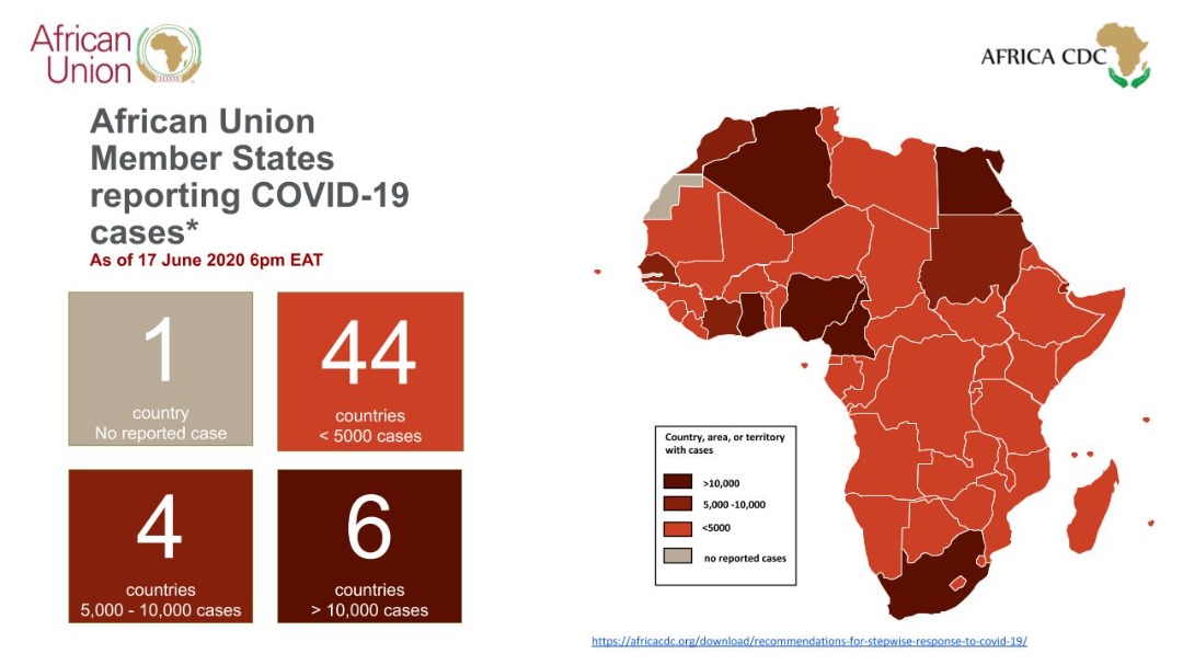 Nota: Además de la captura diaria de las cifras oficiales del Centro de Control de Enfermedades de la Unión Africana, por su interés adjuntamos hoy también un gráfico emitido por el mismo centro, en el que detalla que, en estos momentos, hay un país sin reportar un solo caso (el Sáhara Occidental), 44 países con menos de 5.000 casos, 4 países con entre 5 y 10.000 casos y 6 países con más de 10.000 casos (Sudáfrica, Egipto, Nigeria, Ghana, Argelia y Camerún). La UA insiste en que, pese a acelerarse la pandemia en el continente, 45 países han reportado menos de 5.000 casos oficiales.