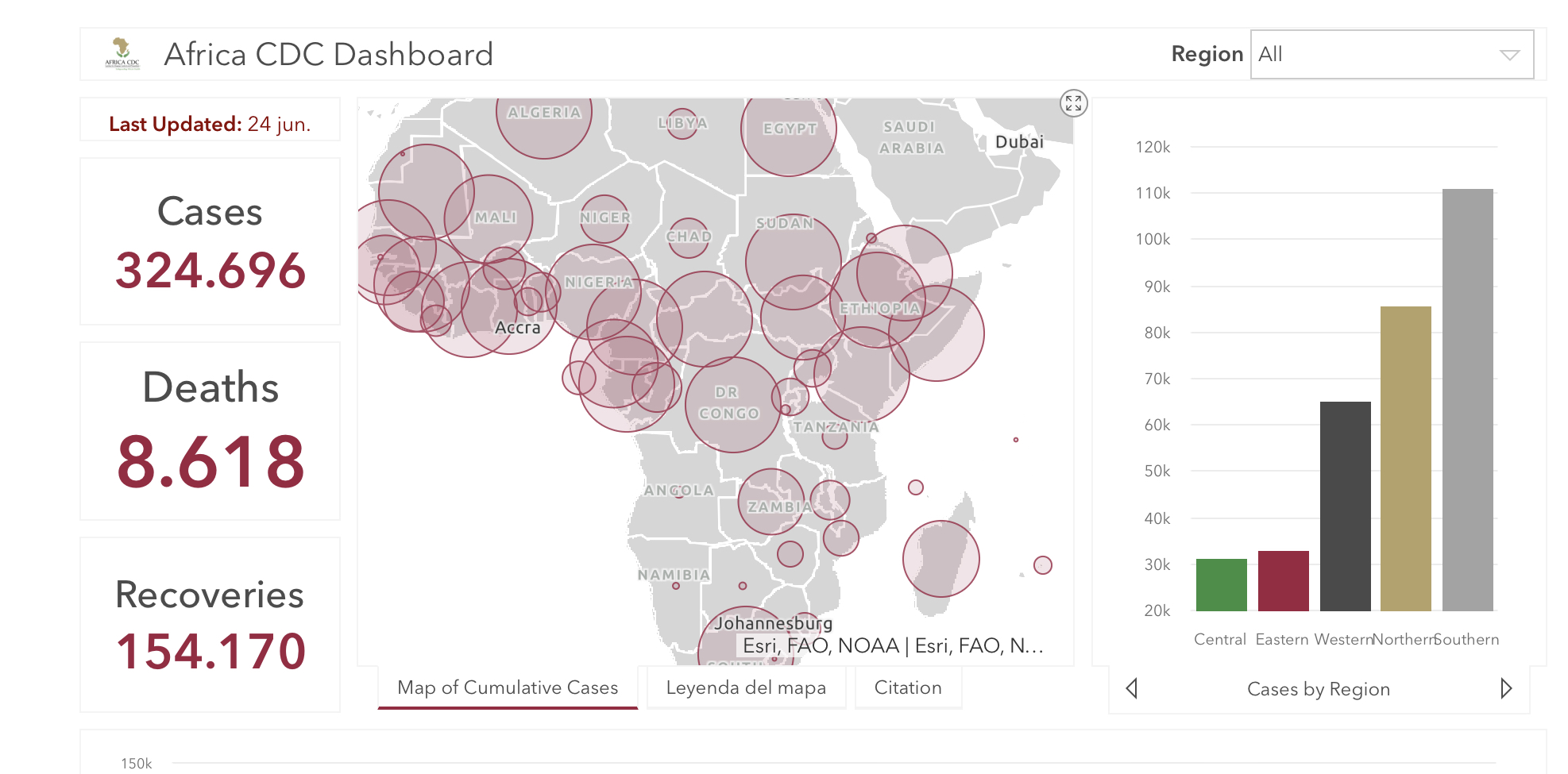 PAÍSES MÁS AFECTADOS: Sudáfrica 106.108, Egipto 58.141, Nigeria 21.731, Ghana 14.568, Camerún 12.270, Argelia 12.076, Marruecos 10.344, Sudán 8.889, Costa de Marfil 7.904, Senegal 6.034, RDC 6.027, Guinea 5.104, Kenia 4.952, Yibuti 4.617, Etiopía 4.848, Gabón 4.849, República Centroafricana 3.051, Mauritania 2.984, Guinea Ecuatorial 2.001, Mali 2.001, Sudán del Sur 1.916, Sierra Leona 1.347, Túnez 1.159.