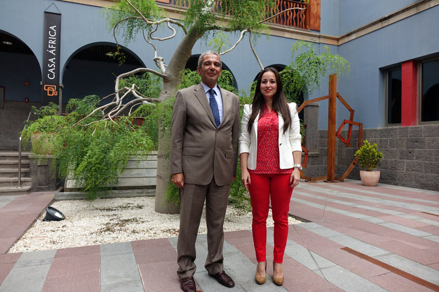El embajador de Egipto en España, Ahmed Shafik Ismail Abdelmoeti, visitó esta mañana la sede de Casa África, donde fue recibido por la secretaria general de la institución, Arianne Hernández, que le mostró las instalaciones de la Casa y le explicó su funcionamiento. El diplomático ya había participado el viernes en la jornada informativa organizada por Casa África bajo la denominación #ÁfricaEsNoticia, que se centraba en conflictos y seguridad en el continente africano y en la que pudo tener un primer contacto con esta institución. Ambas actividades formaban parte de una agenda de visitas y reuniones de trabajo que Casa África organizó al diplomático, que hoy regresa a Madrid tras cuatro días en Gran Canaria.