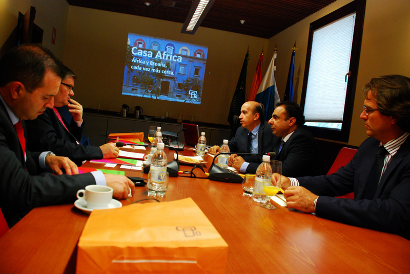 Una delegación de la Cámara de Comercio Brasil-España visitó en la tarde de ayer Casa África para conocer las instalaciones y el trabajo del Consorcio de diplomacia pública. Los representantes de esta delegación, encabezada por Murillo Gabrielle, consejero comercial de la Embajada de Brasil en Madrid y por Antonio del Corro García-Lomas, Director Ejecutivo de la Cámara de Comercio de Brasil conocieron las líneas de trabajo de la Casa presentadas por el Gerente de la Institución, José Luis Márquez, y el Director de la Unidad de Apoyo al Director General, Arístides León.