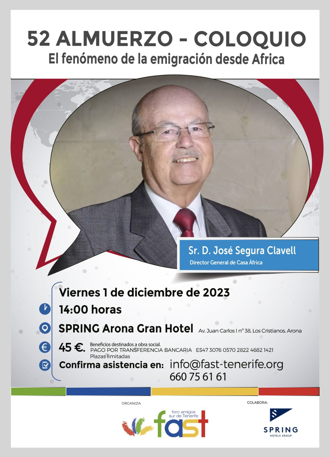 Por toda esta vinculación del Sr. Segura con el fenómeno migratorio, el Foro de Amigos del Sur de Tenerife (FAST) le ha invitado a participar en su 52º Almuerzo/Coloquio, que lleva por título «El fenómeno de la emigración desde África».