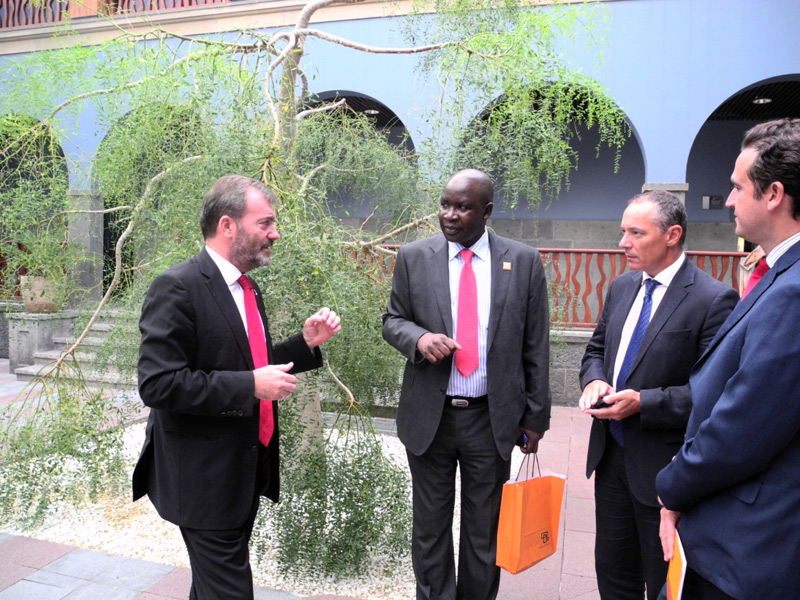 El embajador de Kenia en España, Bramwel Waliaula Kisuya, acudió hoy Casa África en el marco de una visita a Gran Canaria organizada por esta institución. El embajador de Kenia se reunió a primera hora de la mañana con el Director General de Casa África, Ricardo Martínez Vázquez, para conocer la sede del consorcio y profundizar en la posibilidad de realizar algún tipo de acción conjunta para dar a conocer mejor Kenia en nuestro territorio. Tras la visita a Casa África, y acompañado del secretario general Luis Padilla, y el adjunto a la dirección general, Gonzalo Moro, el embajador se reunió con el presidente de la Confederación Canaria de Empresarios, Sebastián Grisaleña, y un grupo de empresarios canarios.