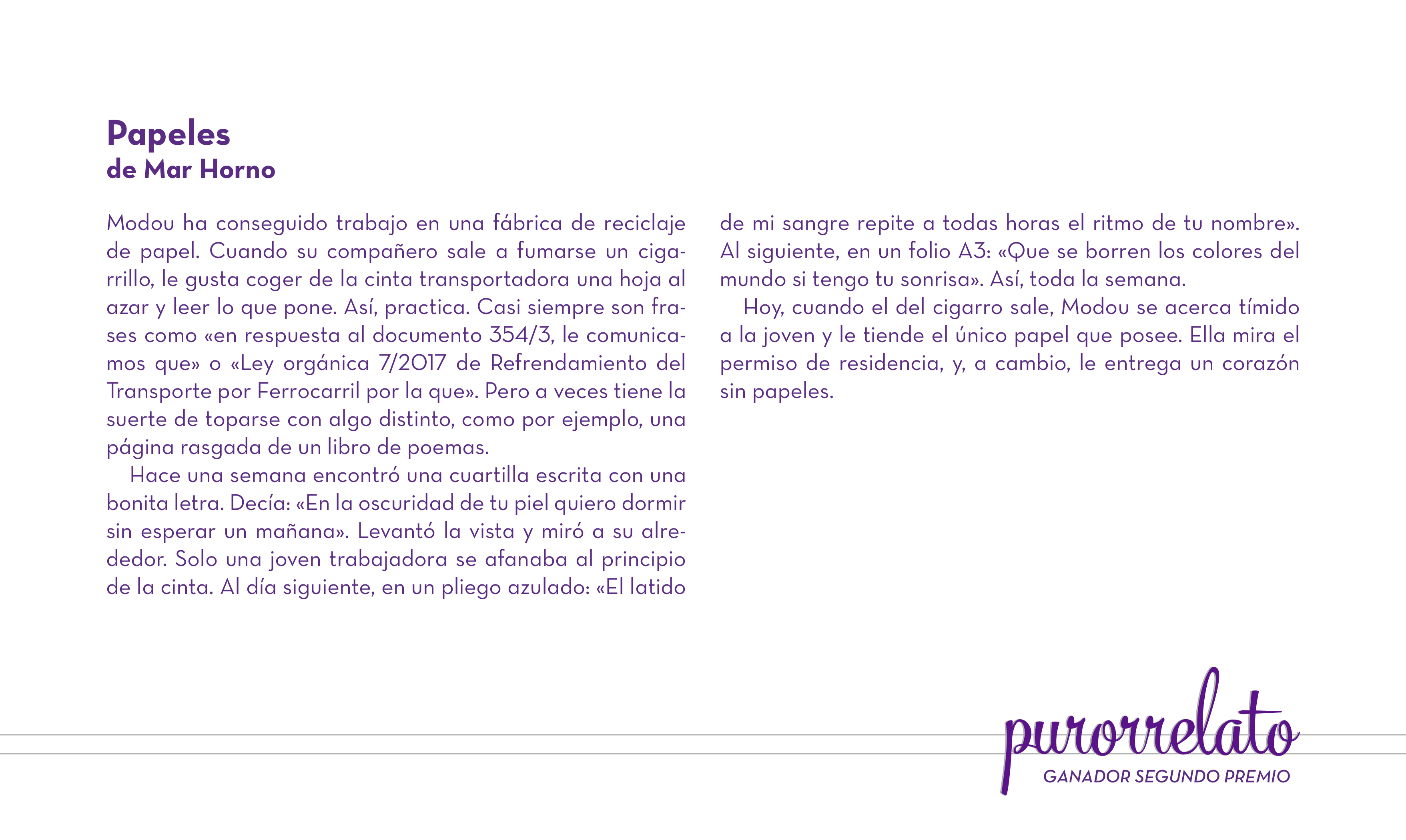El segundo y tercer premio llegan desde el mismo punto de la geografía española: Jaén. Los suscriben María del Mar Horno García, con el microrrelato titulado Papeles, y Plácido Romero Sanjuán, con El pasadero, respectivamente.