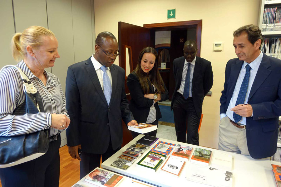 Ils ont également parcouru la médiathèque ainsi que les salles d'exposition de Casa África qui accueillent en ce moment l'exposition Géntu Ndaw, qui veut dire « rêves d'enfant» en wolof. L'ambassadeur a découvert de première main les Collections Casa África qui comprennent entre autres des titres classiques et contemporains de la pensée et de la littérature sénégalaise traduits en espagnol comme Nations nègres et culture de Cheikh Anta Diop ou Les tambours de la mémoire de Boubacar Boris Diop.